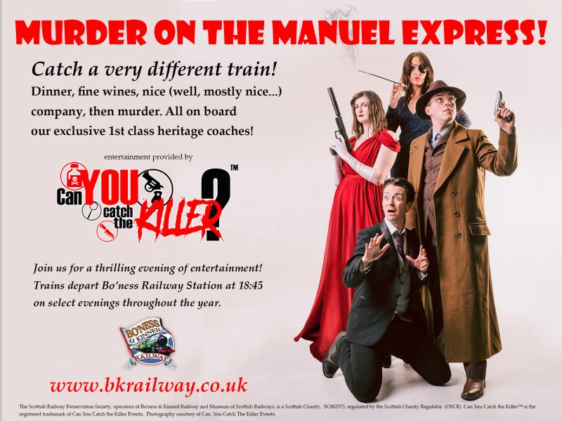 Catch a very different train! Dinner, fine wines, nice (well, mostly nice...) company, then murder. Can you catch the killer™? All on board our exclusive 1st class steam train!